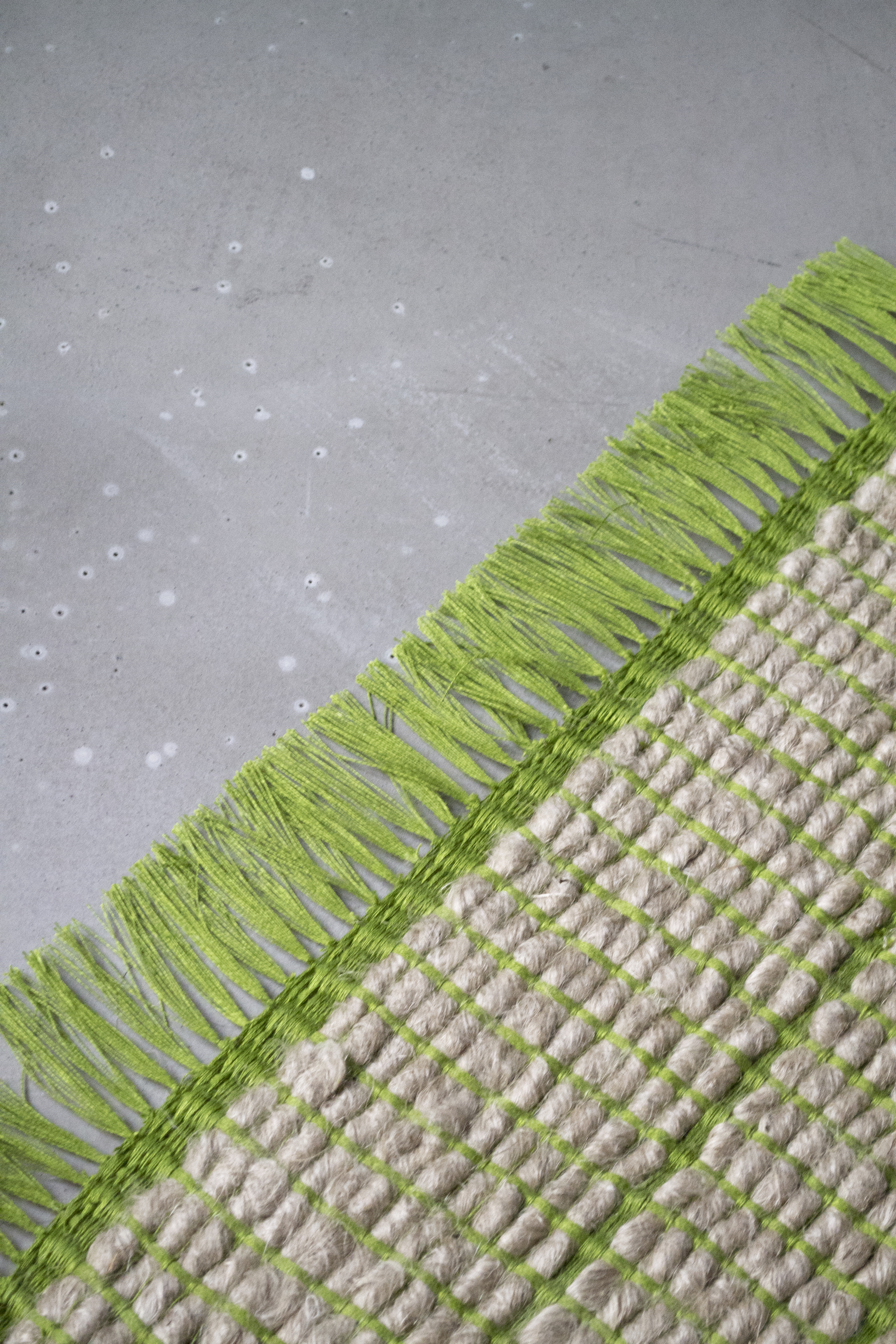 Il est tissé à partir de deux textures singulières qui donnent au tapis diverses textures et finitions. L’intention est de valoriser et de préserver la filière Française du lin, qui tend de plus en plus à se développer sur le territoire national.Cela démontre qu’il est possible de concevoir autrement, en s’appuyant sur des ressources et des savoir-faire français. Egalement, le produit s’attache aux capacités techniques de CINNA dans la production de tapis.